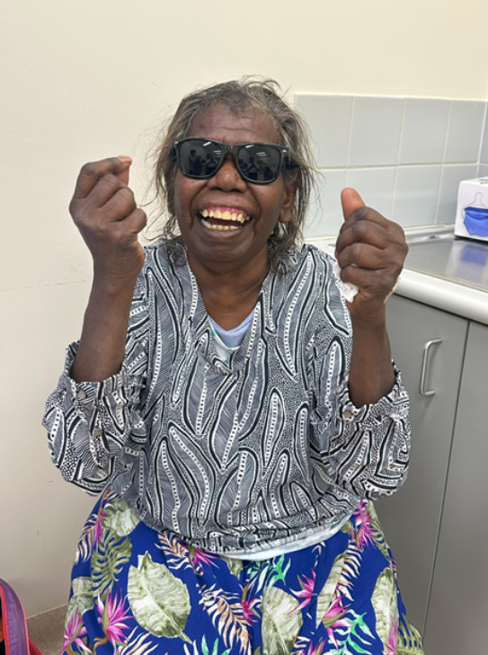 Pictured is super happy Estelle, who was very motivated to come to Katherine for the surgery. She travelled from Minyerri by herself after the local clinic was unable to organise transport for her. She was ecstatic after getting her patch taken off and some new sunglasses.
